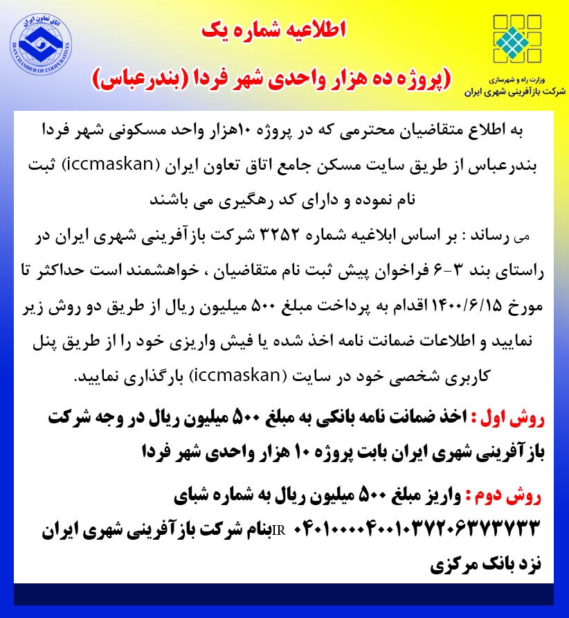 اطلاعیه شماره یک (پروژه ده هزار واحدی شهر فردا (بندرعباس))